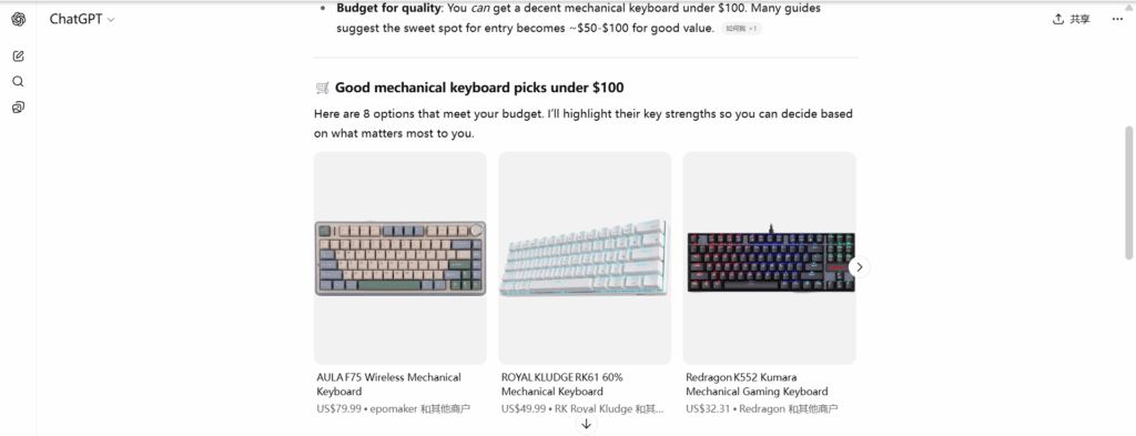 Recently, OpenAI announced a major update — ChatGPT now supports shopping directly within chats. This means that when a user says something like “I want to buy a pair of running shoes in this style,” the AI will no longer just provide search suggestions. Instead, it can display products, show price comparisons, and even link directly to purchase.