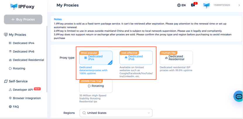 For example, in IPFoxy Proxies, IPv6 is only vailable on limited websites such as Google/Facebook/YouTube/Ins/Linkedin, etc.