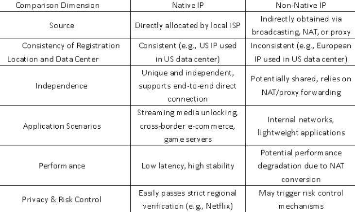 A non-native IP is obtained indirectly through broadcasting, proxy, or NAT technologies. Its registration address differs from the actual usage location. These IPs are usually cheaper but may be blocked by region-restricted services.