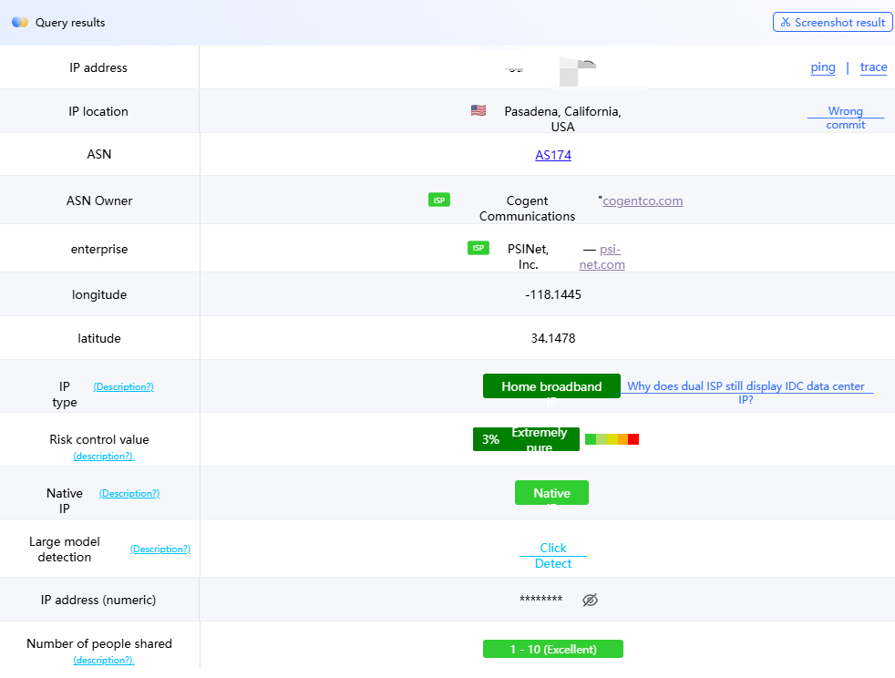 A simple method is to use the proxy detection tool Ping0, which directly shows whether the IP is native or broadcast.