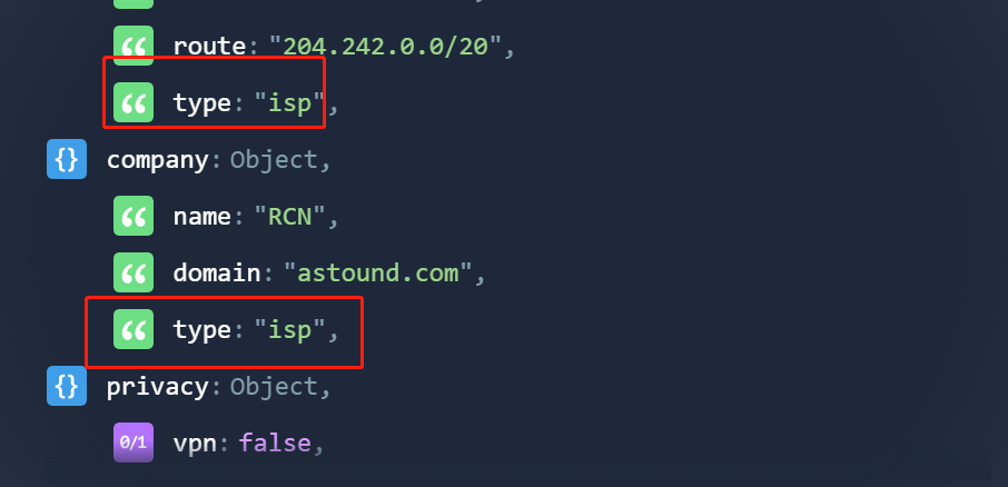 可以在ipinfo查询是否为双ISP。在type一栏可以看到结果,如果是双ISP,两栏都会显示type:“isp”。如果显示type:“hosting”,则一般为机房IP。