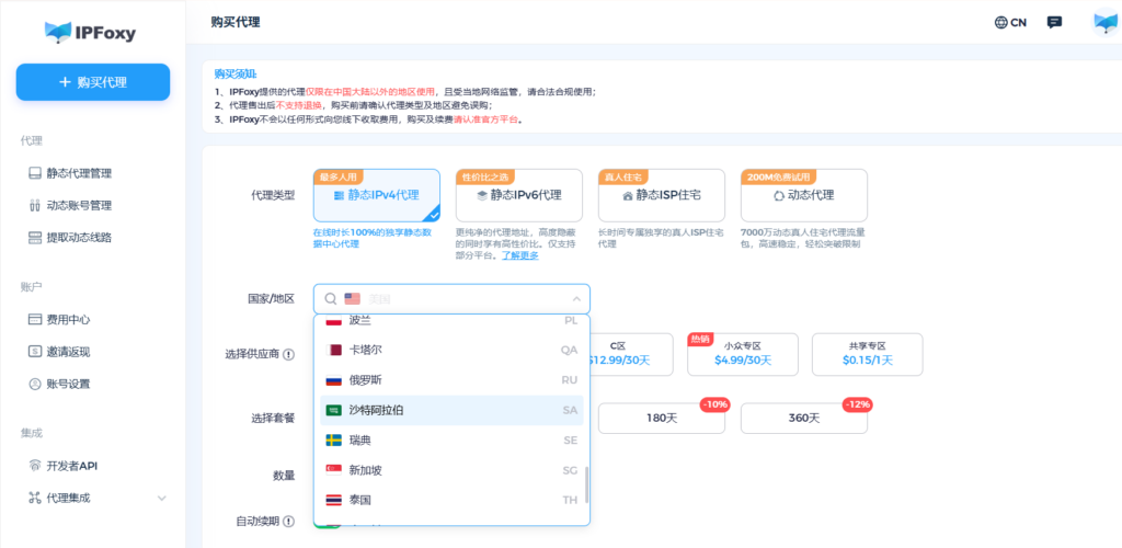 以在IPFoxy提供的代理类型为例,数据中心代理适合市场营销、广告验证场景;动态代理适合批量业务、数据采集业务,而静态住宅IP引起独享、真实性质,在跨境电商/海外社媒多账号中更占优势。