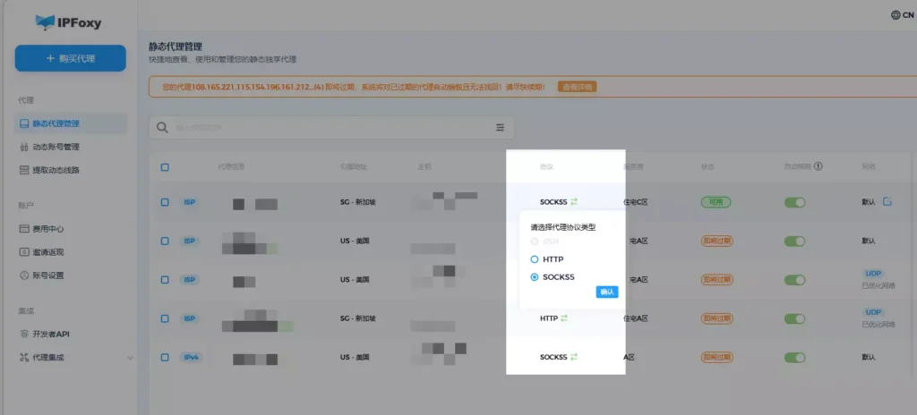 以 IPFoxy 全球代理服务为例,它提供的代理IP服务支持 HTTP、SOCKS5多协议灵活切换,用户可以根据全球不同业务场景的需求,随时调整代理类型,无论是网页数据抓取、自动化任务还是复杂网络请求,都可以快速适配。