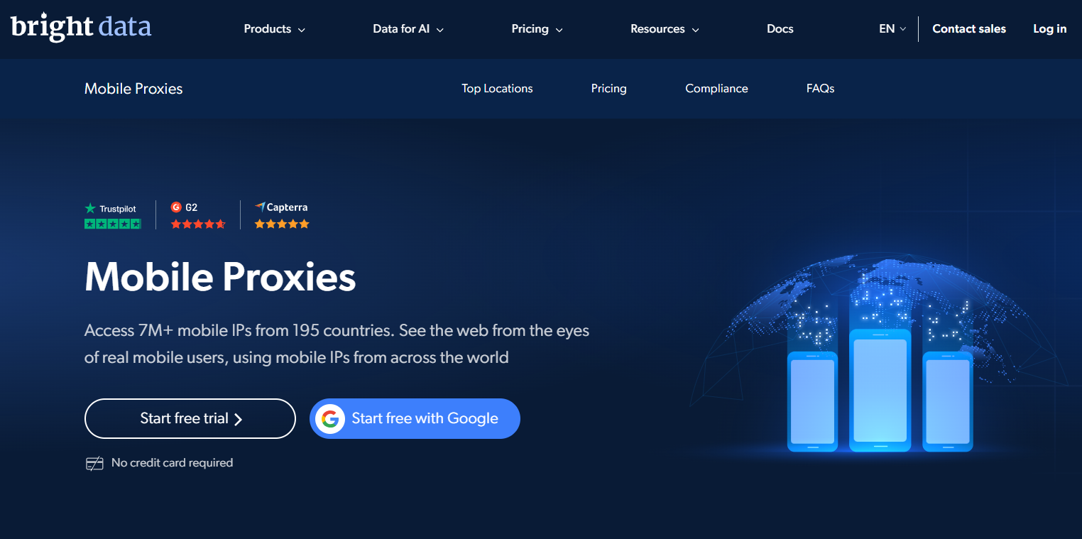 Bright Data 一直是代理行业中的”全能型选手”,其移动代理网络覆盖 195个国家,拥有超过 700万个移动 IP 。