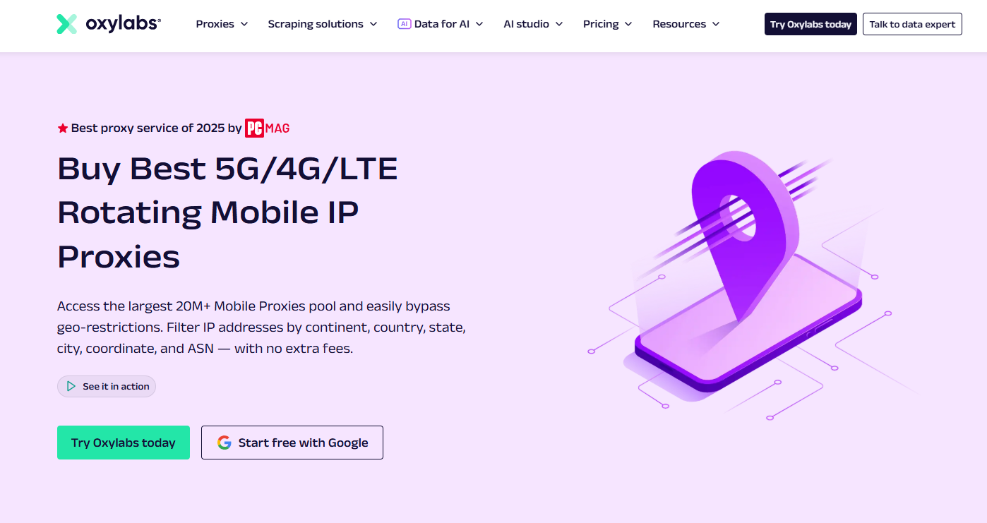 Oxylabs 在高防护网站环境中表现突出,拥有 1.77亿+ IP池(含住宅和移动)。