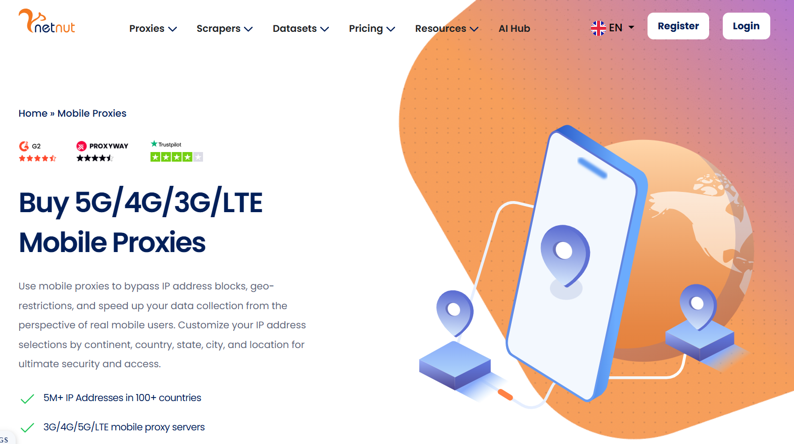 NetNut 采用 ISP 直连模式,而非传统 P2P 网络。拥有 8500万+ IP池,覆盖 195+ 国家 。