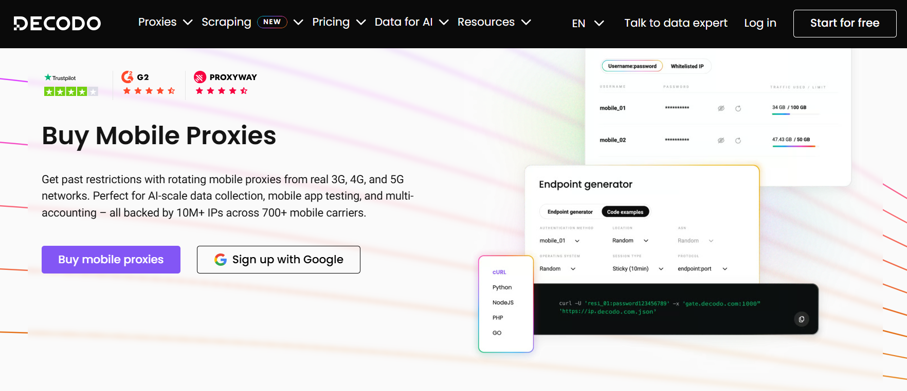 | Decodo | 1000万+移动IP | 160+ | 92-95% | $4/GB |