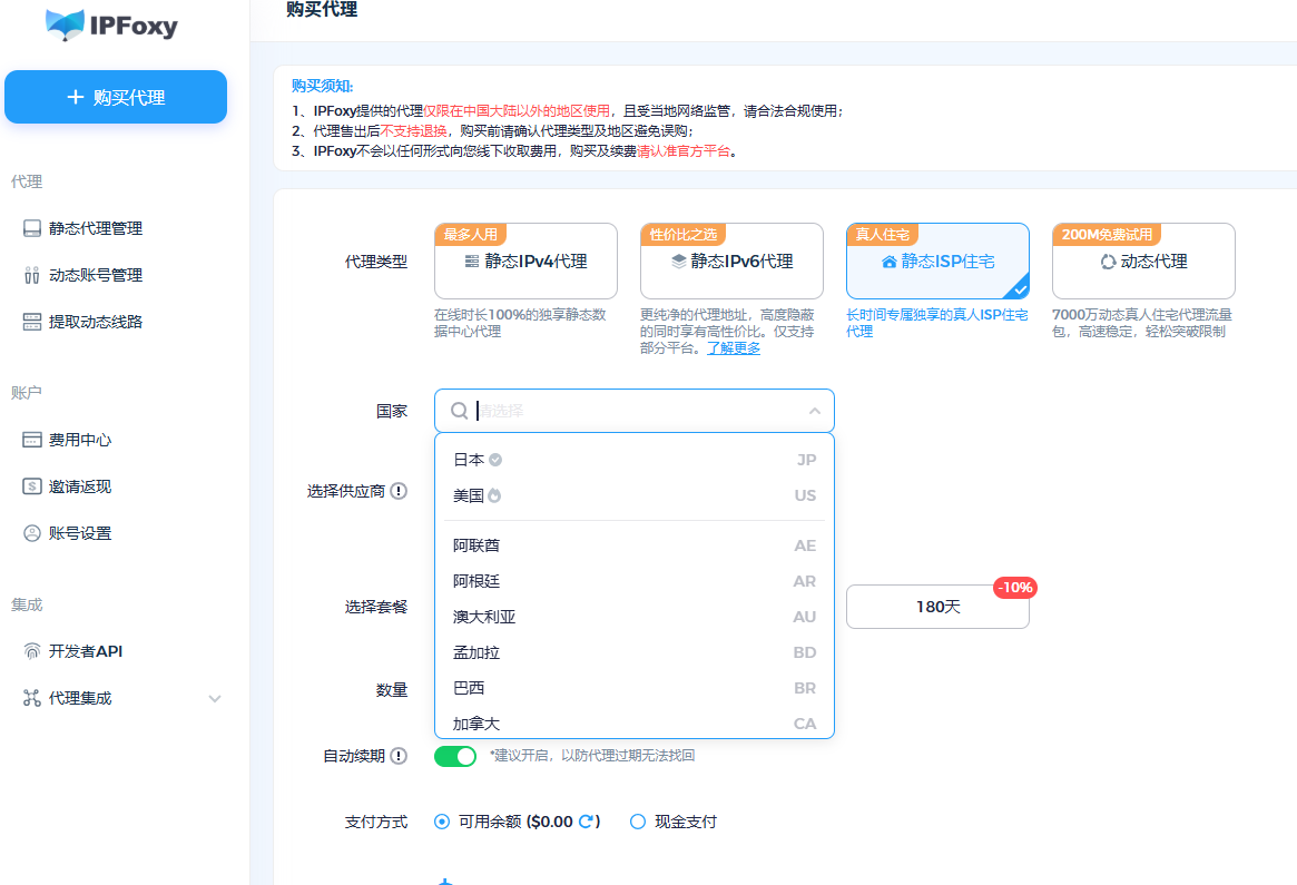 推荐使用IPFoxy这样的高质量代理服务商,IPFoxy 提供的住宅IP和静态专用IP,可以帮助卖家模拟真实用户网络环境,避免使用廉价数据中心IP被TikTok识别为异常。同时,IPFoxy支持指纹浏览器和多账号管理工具的代理配置,适合搭建账号矩阵或做跨区运营。