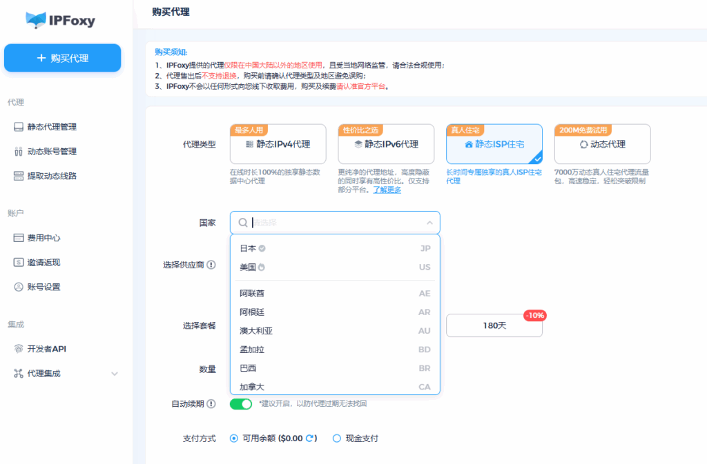 这里就可以选择行业内比较稳定的服务商,比如IPFoxy。