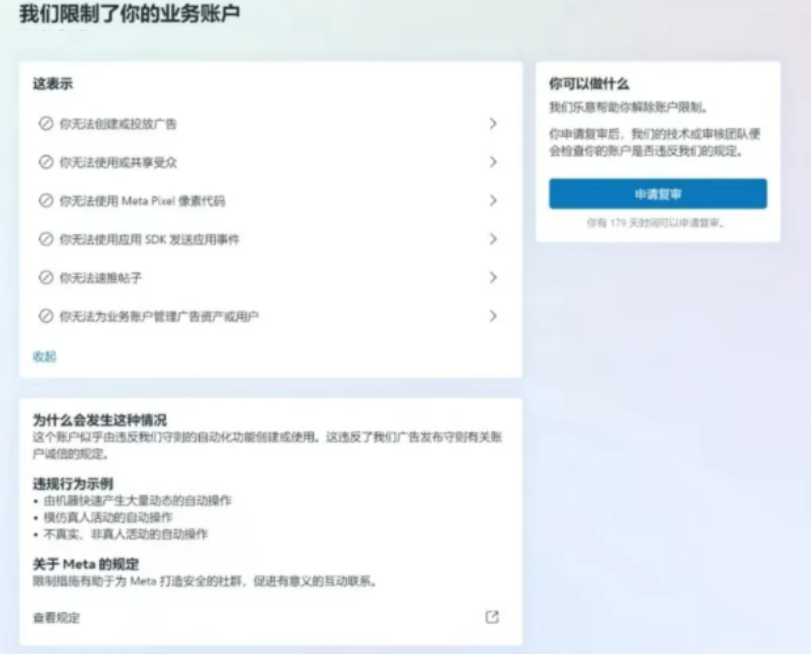 如果一个BM绑定了多个广告账户,而其中任意账户因违规投放被封,BM很容易被系统认为存在“高风险关联”,连带进入监控范围。另一方面,频繁绑定、解绑主页、像素、广告账户也会让系统判定该BM操作异常,触发警告甚至限制。