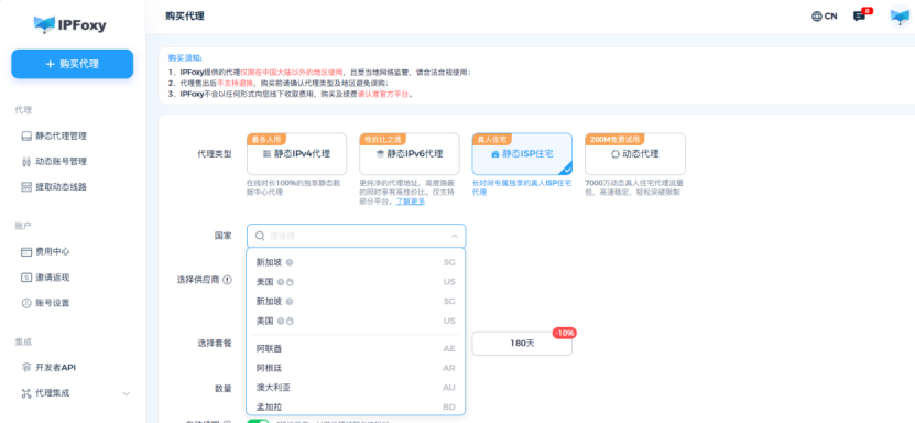推荐使用IPFoxy纯净代理,确保IP纯净度和稳定性。IPFoxy提供了企业级真实纯净代理,适合开发者搭建真实环境测试、开发者账号环境防关联。
