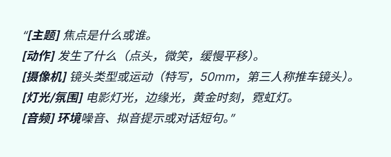 Google Veo 3更擅长制作拥有简短、具体的场景描述的视频。因此,你可以把提示词写成一系列微镜头列表:主体→动作→摄像机→灯光→氛围→声音。示例结构: