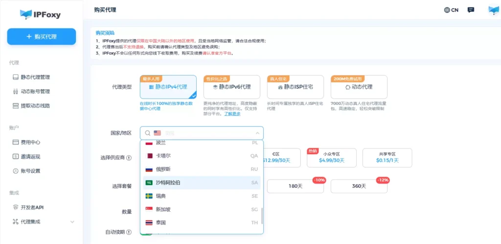 推荐IPFoxy 提供的稳定、干净、独享的代理 IP。与公共代理不同,IPFoxy的代理IP 纯净度高,可信度高,不易触发平台风控,并且支持城市级定位。