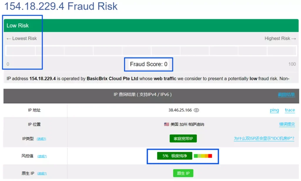 以IPFoxy静态住宅IP为例,前往Scamalytics检测,结果显示其得分为0,ping0的检测结果显示风控值仅为5%,说明这是一个干净且可靠的IP,大概率减少Telegram风控限流的情景,帮助解决Telegram视频一直转圈、加载异常的问题,极大提升观看和使用效率。
