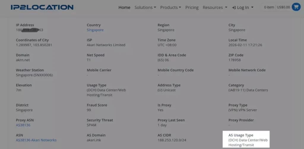 建议在使用前检测IP属性、ASN等详细信息,帮助你确认代理类型。以ip2location为例,若显示为isp,则为住宅IP;若显示为hosting,则属于服务器IP。