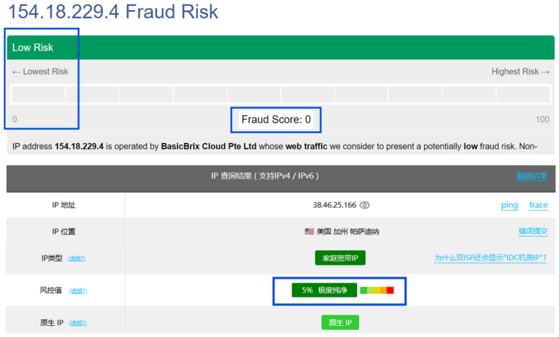 以IPFoxy静态住宅IP为例,通过较常见的IP检测网站检测结果显示欺诈分其得分为0,风控值仅为5%,说明这是一个较为干净且可靠的IP。