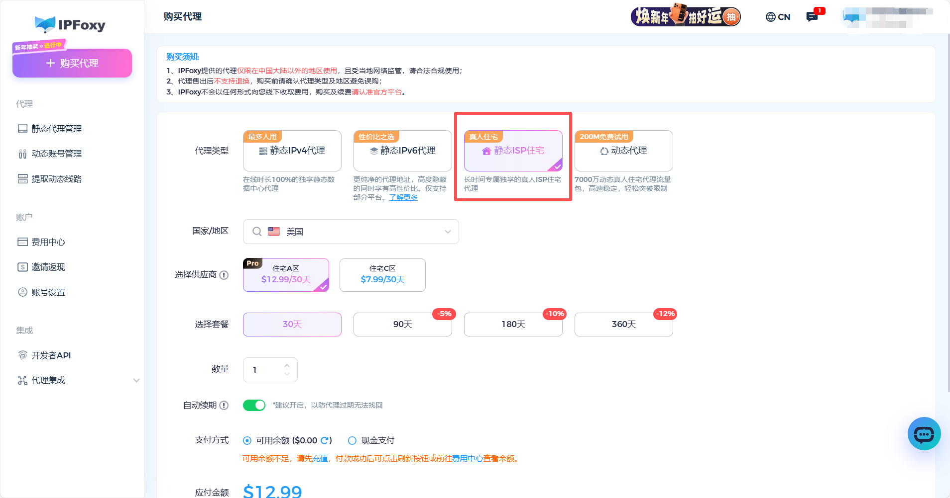 步骤一:进入IPFoxy账号操作页面,选择静态住宅IP-目标人群地区/国家。