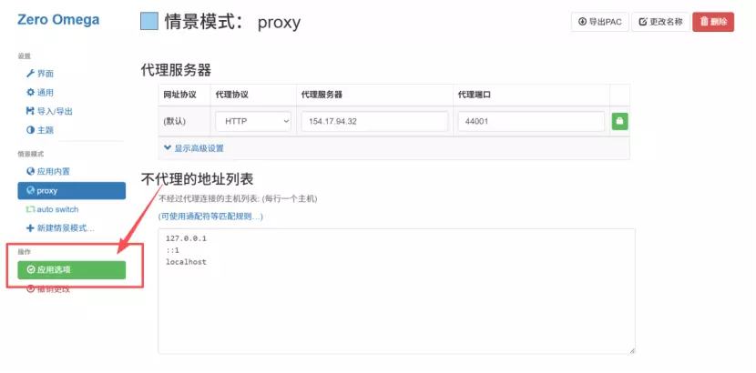 通过代理配置插件完成配置,这里使用ZeroOmega(Swithyomega),通过配置从IPFoxy获取的代理协议、代理服务器、端口密码即可完成浏览器配置。