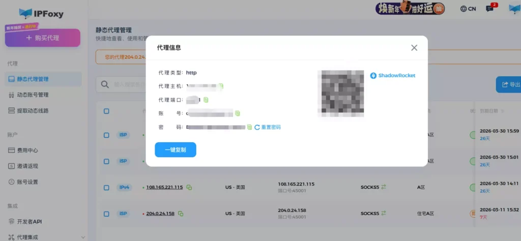 我们通过IPFoxy获取静态住宅ISP代理信息。经过实测,IPFoxy的独享IP纯净度高,且可以快速接入浏览器使用,适合多账号环境绑定。