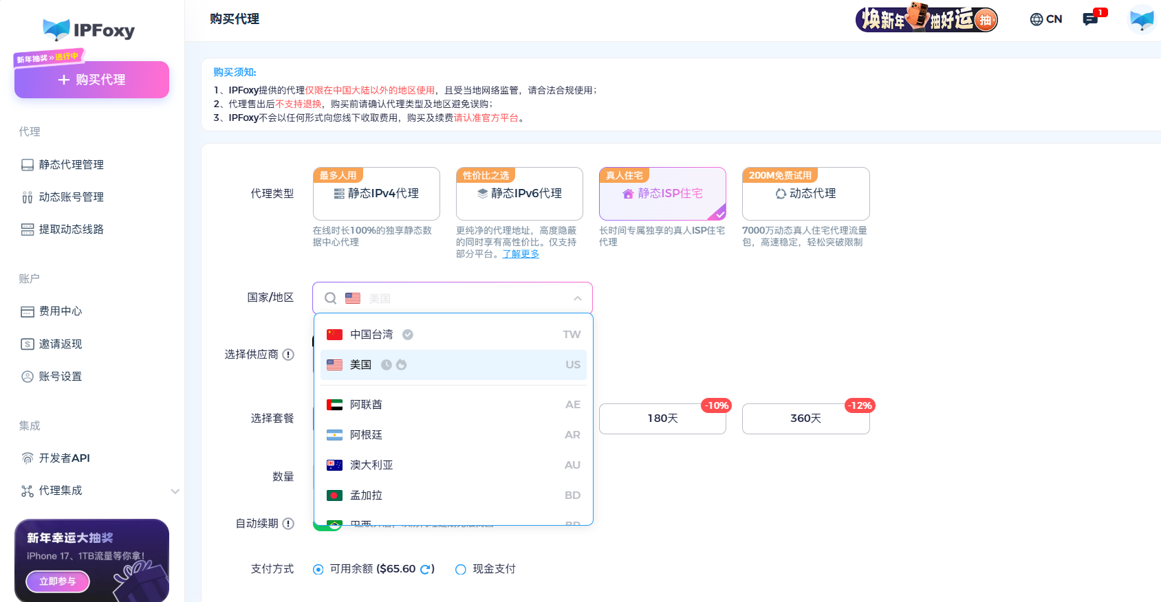 避免使用共享IP、机场IP网络设备,一般此类IP可能已被Google标记并黑名单。建议更换纯净独享的代理网络,我们从IPFoxy可以获取到静态独享住宅IP资源,选择与目标地区匹配的国家,将代理信息配置指纹浏览器、Chorme浏览器、手机设备来完成网络的隔离。