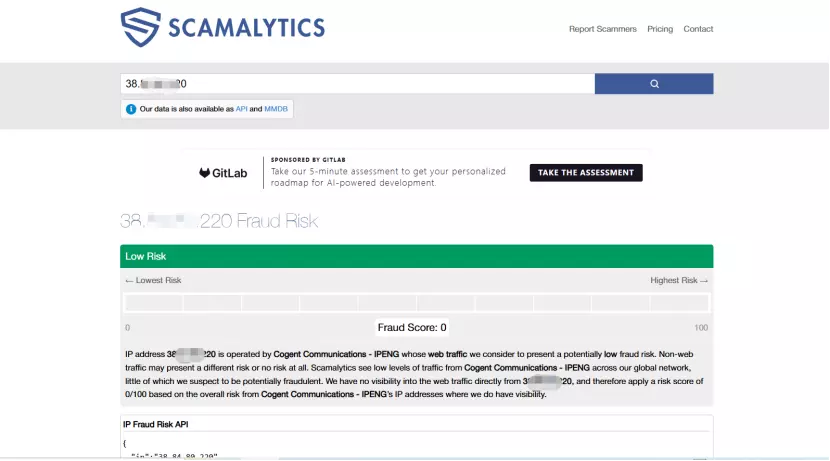 判断IP类型、质量是否达到期望。重点可以检测IP是否进入黑名单、IP欺诈值等指数。以下以IPFoxy为例检测其获取的静态住宅IP欺诈值,以Scamlystic检测结果为例,低欺诈值说明来源纯净,则适合长期登录Claude使用。